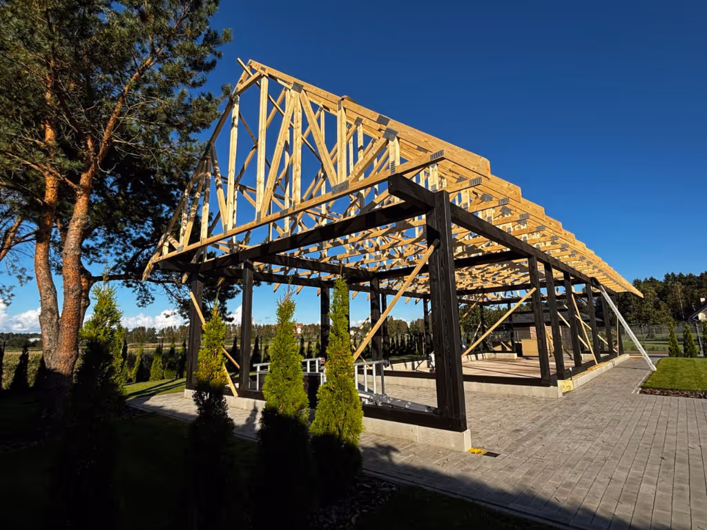 The project was completed in good time, even faster, it took only 2 weeks. The manufacturer does not have an assembly team, but has good partners who provide this service and who are usually recommended to the customers of Freimans Timber Constructions. The timber trusses from the truck were mounted onto the roof in a certain order using special equipment, and they were installed in the right fastening places. The work was carried out by two people. The trusses are not too heavy, on average they weigh approximately 70 kg, they can be lifted and moved by two people easily. The owner is satisfied with the quality of the product and the service. He is convinced that it was the right choice.