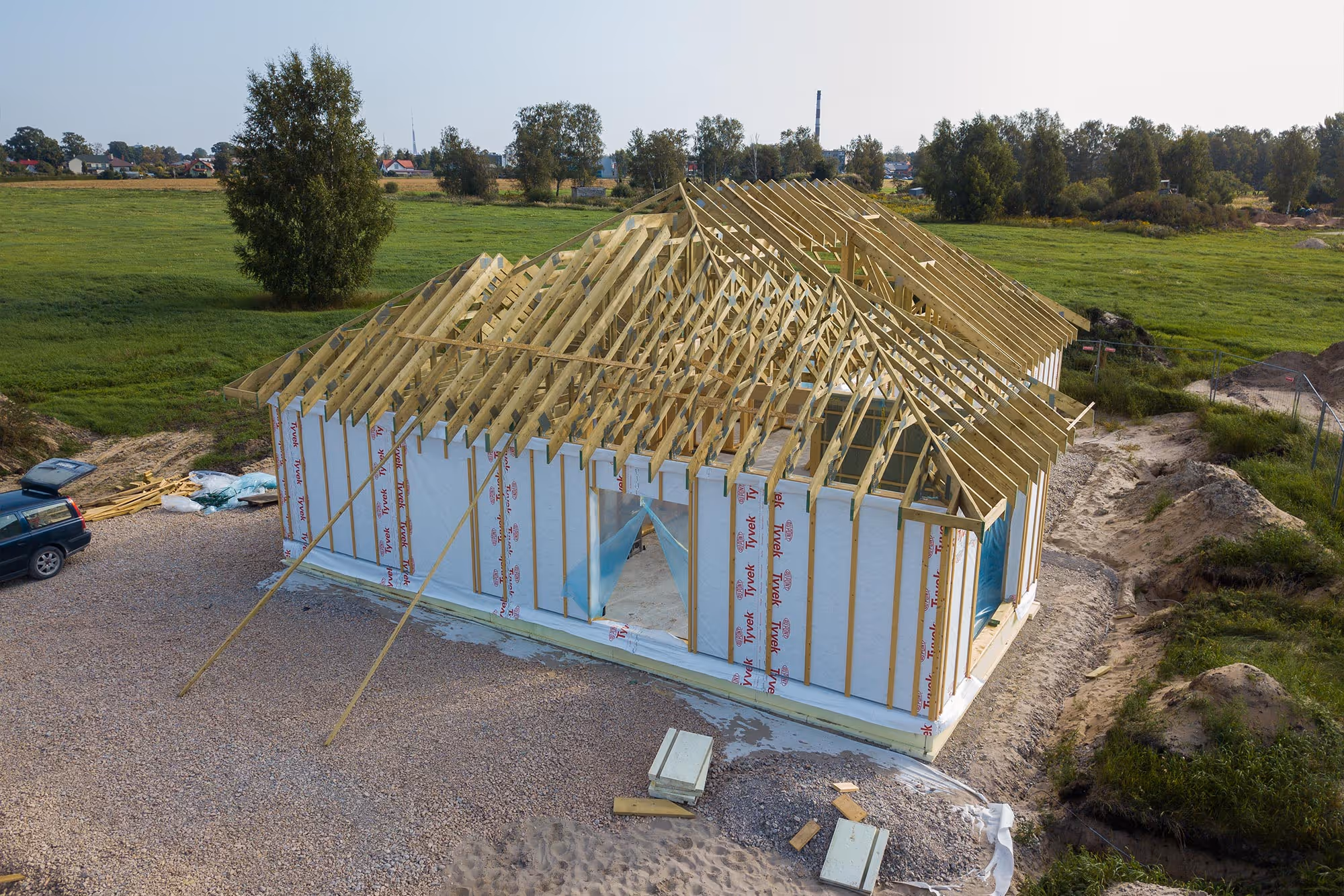Roof structures are an essential load-bearing component of a building, ensuring the stability and durability of the roof. Today, industrially manufactured timber trusses are widely used and are suitable for both private houses and larger buildings such as warehouses or hangars. They help reduce construction costs, optimize the use of timber materials, and speed up the installation process, as the structures are produced in a factory and only need to be assembled on site. Timber trusses are lightweight, durable, and allow for large spans without additional supports, while ensuring efficient load distribution and providing greater architectural flexibility.
